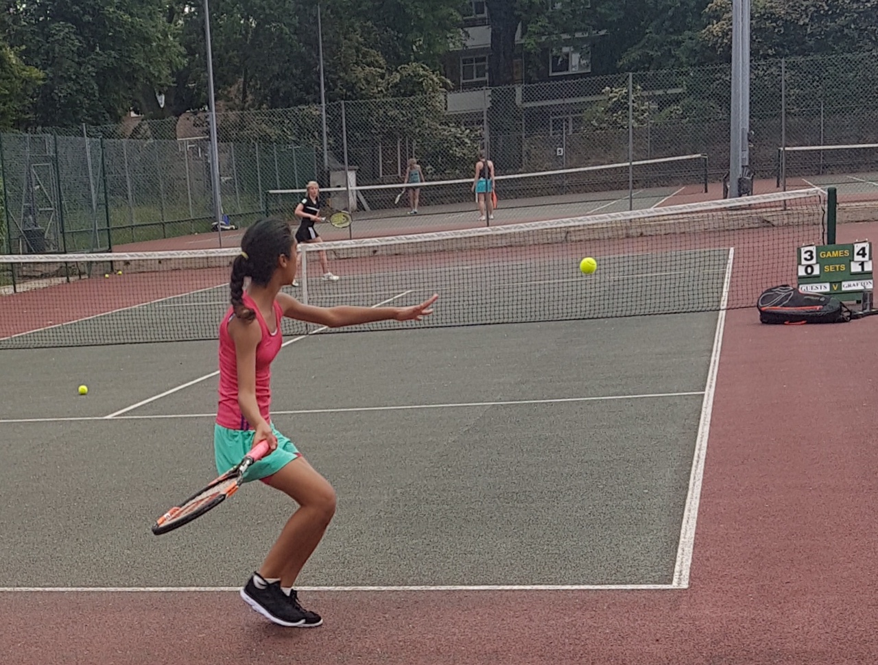 Then Louise wobbled, distracted by a magpie swooping on a Grafton fox perhaps, and two doubles later it was 4-5, but he Grafton girl righted the ship with some magnificent retrieving (she IS quick!) to win the rubber 6-4 6-4.