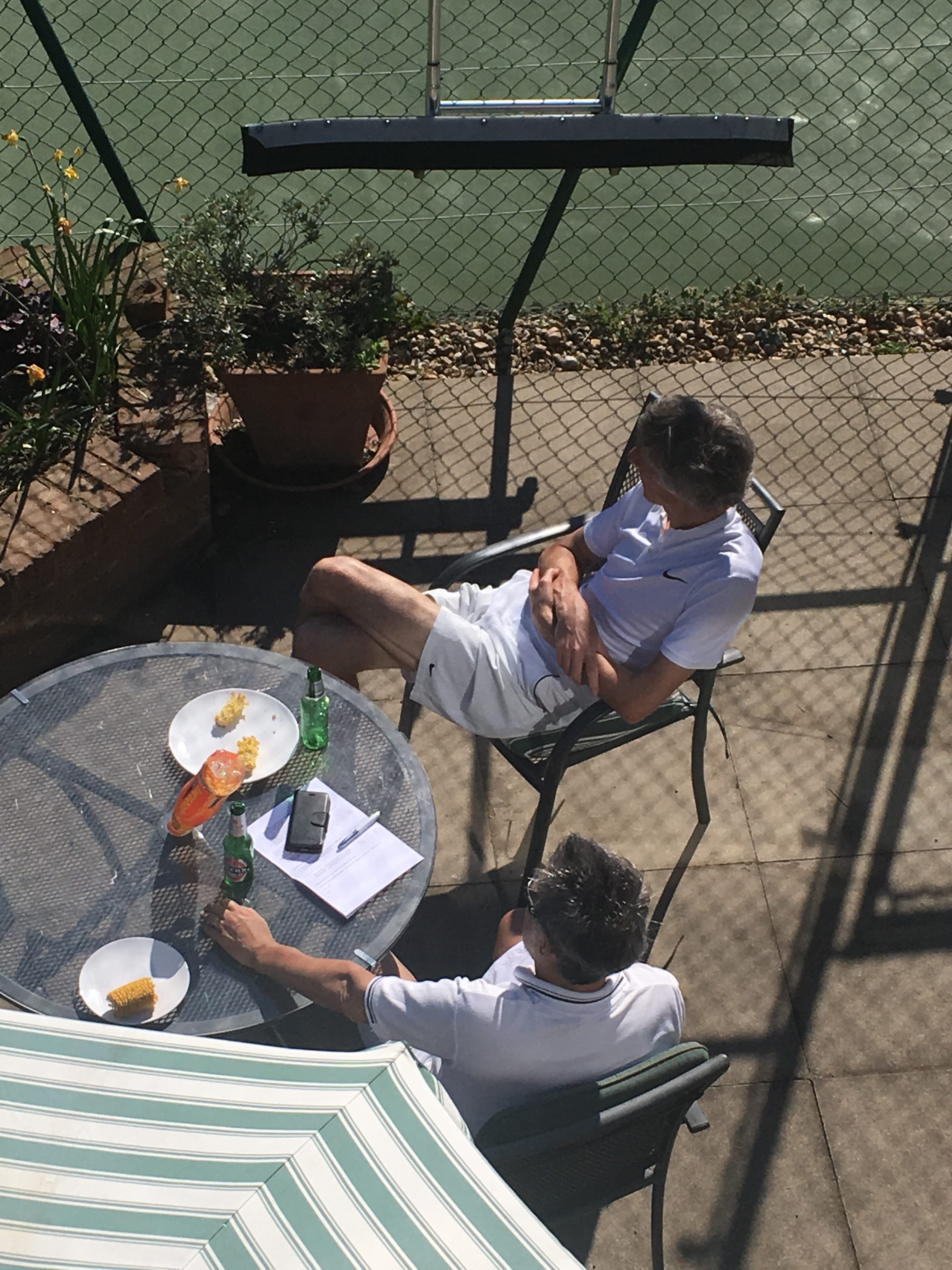 Dressed in full tennis whites and armed with three bananas, Dougie and TP’s Steven Hoy descended on Court 2 where Steve was exposed to Dougie’s unbelievable ability to slice his way out of most situations.